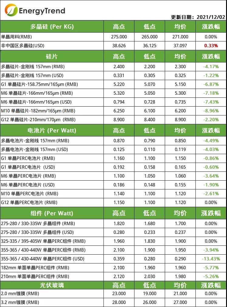 據(jù)集邦新能源12月2日最新光伏產(chǎn)業(yè)鏈價格信息,硅料環(huán)節(jié),目前整體硅料價格無明顯波動,單晶用料的均價維持在271元/KG;本周硅片報價大幅下跌,M6、M10報價明顯下滑。