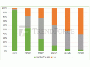根據(jù)集邦咨詢研究,2021年組件產(chǎn)能大幅擴(kuò)充,量產(chǎn)最高功率邁向650W+,中國(guó)高功率(≥530W)招標(biāo)需求占比升至65%。到2021年年底,大尺寸組件(182&210mm尺寸)產(chǎn)能達(dá)274.9GW,市場(chǎng)占有率62.1%。其中210新增產(chǎn)能121.6GW,占新增產(chǎn)能比重57%。